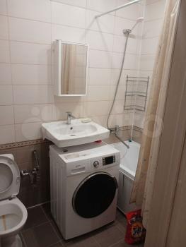 Ванная комната совмещённая, с современной сантехникой и стиральной машиной. Входная зона оборудована вместительным шкафом для хранения вещей.