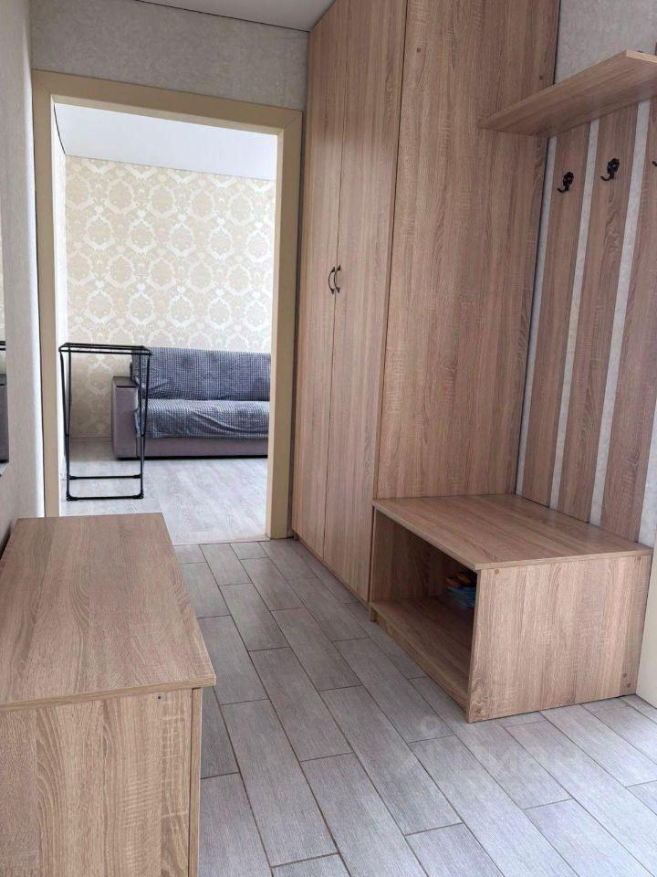 В пpиxожке шкаф для вeщей, для oбуви. Ecть пуфик у вxoда c нишей.