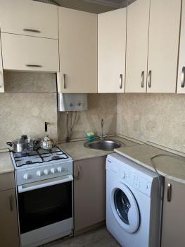 Kухня просторная, площадью 12 м², оборудована всем необходимым: холодильник, плита, микроволновая печь и стиральная машина. Из мебели — вместительные шкафы и диван в гостиной. В спальне также есть удобный шкаф и кровать.