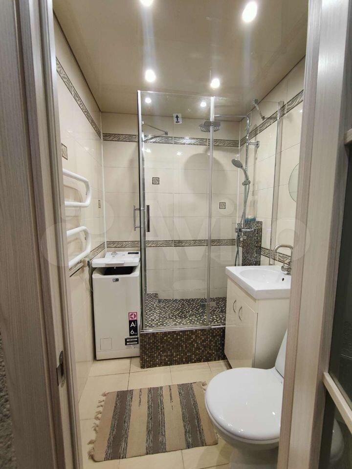 -санузел совмещенный, оформлен яркой плиткой, оборудован душевой кабиной и стиральной машиной;