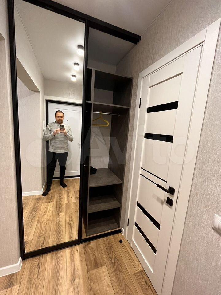 Кухня площадью 8 м² оборудована необходимой бытовой техникой, включая холодильник и плиту. В комнате установлены шкафы для хранения вещей. Санузел раздельный, оснащен ванной и стиральной машиной.