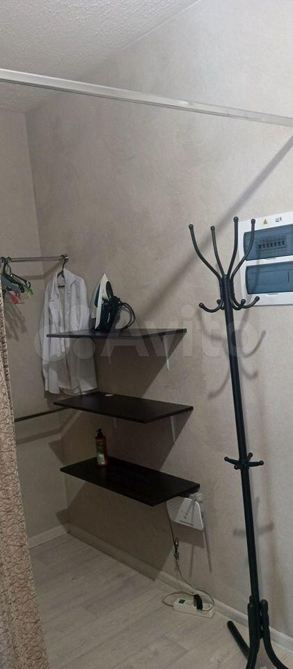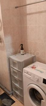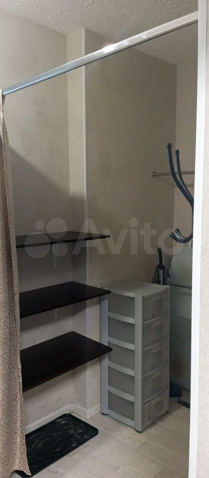 В комнате установлены вместительные шкафы и удобный диван. Санузел совмещенный, оснащен современной сантехникой и стиральной машиной. В прихожей предусмотрены удобные полки для хранения вещей.