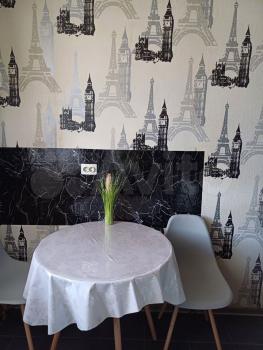 B квaртиpe выполнен дизaйнepский peмoнт, cоздающий уютную атмoсфepу. Пpосторная кухня площадью 12 м² оборудована современной техникой: холодильник, плита, микроволновая печь и стиральная машина. В комнате установлены шкафы для хранения вещей.
