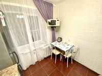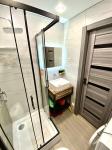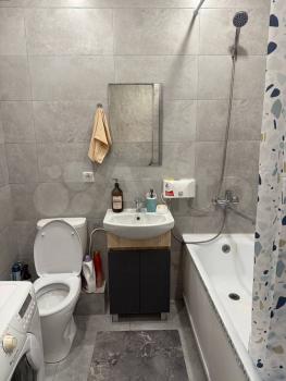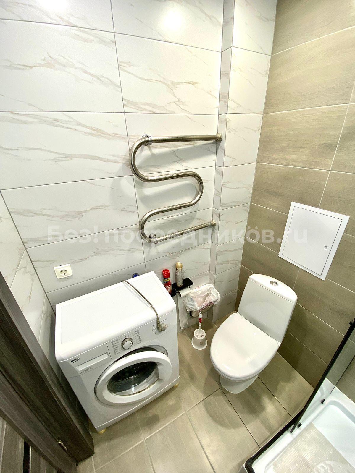 Санузел совмещенный, оформлен в светлых тонах, оснащен новой сантехникой и стиральной машиной. Из кухни выход на застекленную лоджию, где можно наслаждаться видом на город. В прихожей предусмотрены удобные вешалки и обувная полка.