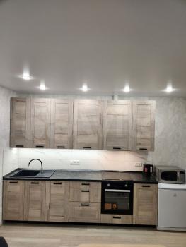 Кухня оснащена новой бытовой техникой: индукционной плитой, микроволновая печь, двухкамерный холодильник с дисплейным регулированием температуры, гибкий смеситель с возможностью установить фильтр для питьевой воды, современная глубокая мойка с дозатором для моющего средства, удобная сушилка для посуды и овощей, посуда