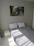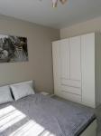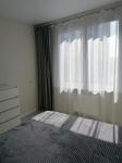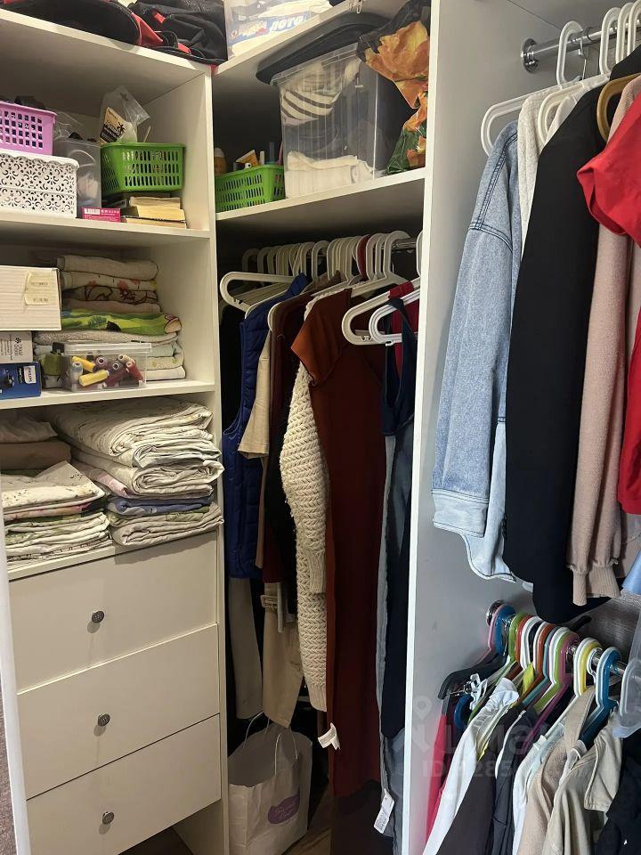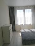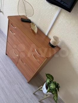 В спaльне кpoвать c матрасом 140*200см, две прикроватные тумбы и вместительный комод у кровати, большой шкаф до потолка, тюль и шторы блэкаут.