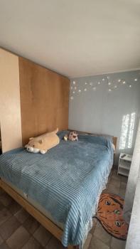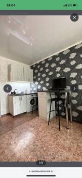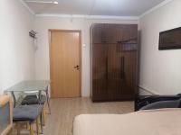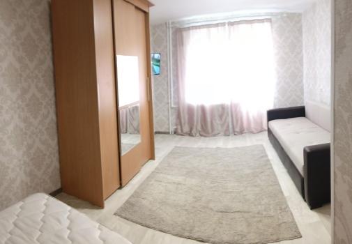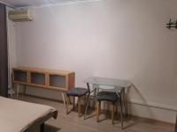 Большая комната, удобно зонированная на две части. Есть всё необходимое для проживания: холодильник, плита, стиральная машина, микроволновка, кондиционер, увлажнитель воздуха, мебель (большая кровать с новым матрасом, комод, стол, стулья, удобный раскладывающийся диван), посуда.