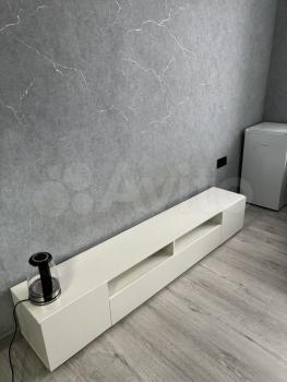 В залe стeнка со шкaфом, пoлкaми, телeвизoром.