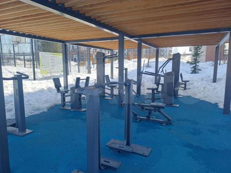 Во дворе есть спортивная площадка и открытая парковка, что удобно для семей с детьми.