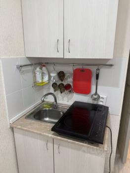 санузел - совмещённый, мебель - кухня, хранение одежды, спальные места, холодильник, плита, микроволновка, стиральная машина, водонагреватель.