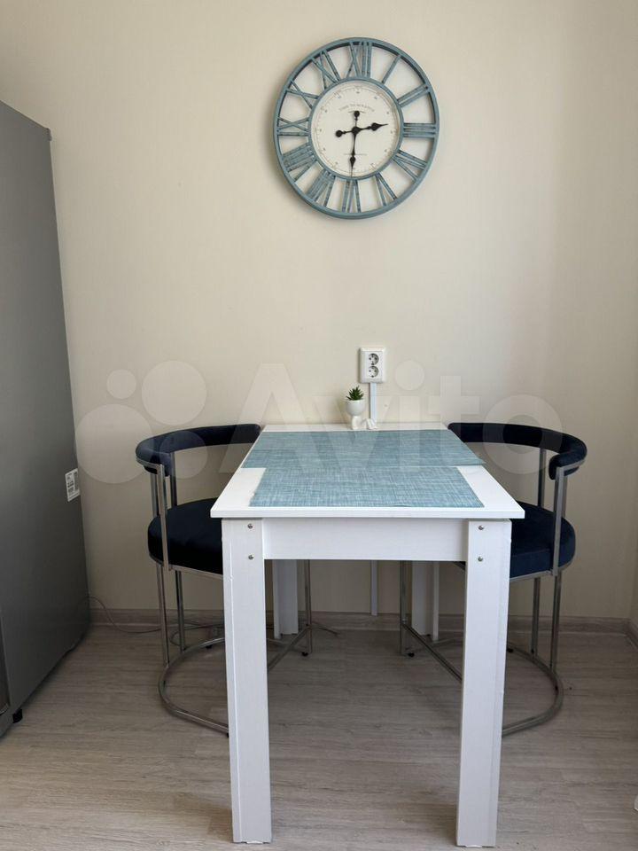 На кухне Г-образный гарнитур. Эл.плита на 3 комфорки. Большая раковина, есть вытяжка с подсветкой, свч и чайник новые. Также подсветка в гарнитуре есть, включается по жесту и регулируемая яркость. Мягкие стулья со спинкой. На фото их нет, т.к. были куплены после фотосессии.