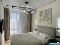 - Спальня с двухспальной кроватью, телевизором, кондиционером, рабочей зоной и выходом на балкон;
