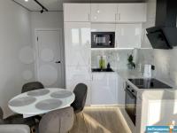 - Кухня-гостиная с мягким диваном, обеденным столом, телевизором и кухонным гарнитуром со встроенной микроволной печью, холодильником, духовкой и индукционной плитой.