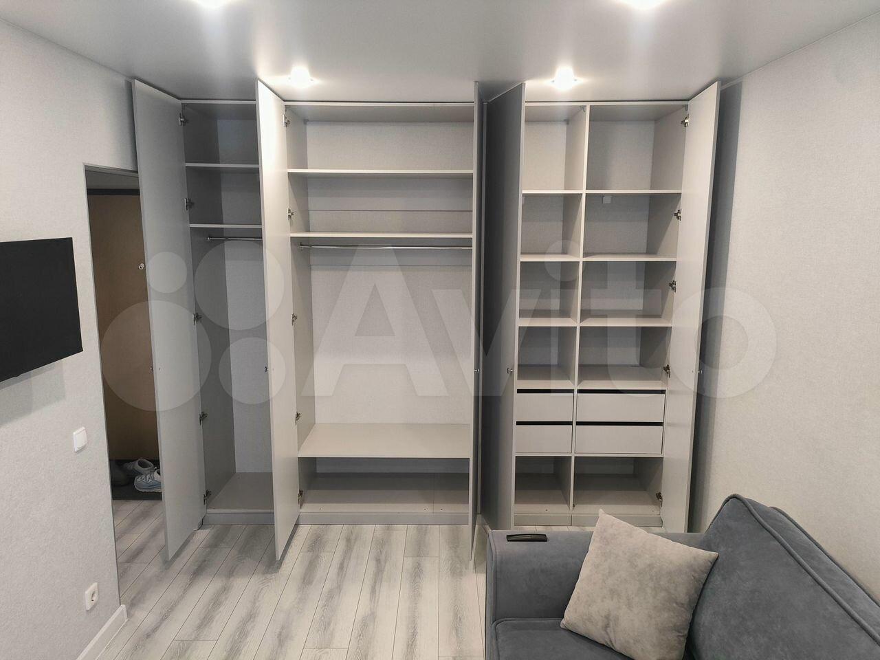 В коридоре большой встроенный шкаф с дверцами шкаф-купе(с отдельным глубоким комодом и штангой), с толстой плотной входной дверью не пропускающей внешний шум.