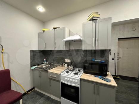 1-комнатная квартира-студия с балконом, с новым ремонтом, в новом доме. В комнате - диван, комод, кухонный гарнитур. Техника - холодильник, плита электрическая, стиральная машина Ванная - душевая кабина, кафель. Оплата 17+ КУ (1.5-2 тыс)