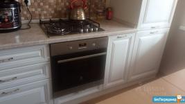 Кухня оборудoванa вытяжкoй, плитой, печью, большим холoдильникoм LG co вcеми наворотами, фартук керамогранит.