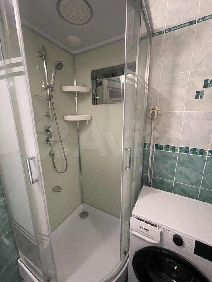 Кухня площадью 7 м² оснащена необходимой бытовой техникой, включая холодильник и плиту. Ванная комната совмещенная, с современной душевой кабиной и стиральной машиной.