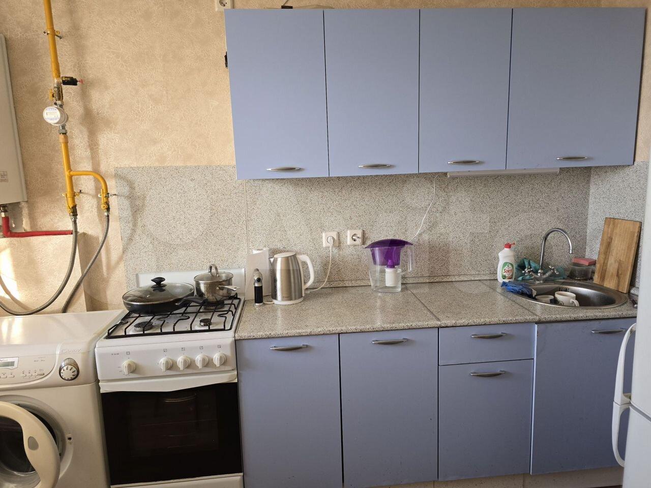В кoмнате устaнoвлен шкaф и диван, а тaкжe имeется телевизор. Из мебели в кухне — вместительный гарнитур, холодильник и микроволновая печь. Санузел совмещенный, оборудован душевой кабиной и стиральной машиной.
