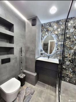 В спальне просторная кровать и вместительный шкаф. Санузел совмещённый, оформлен в современном стиле с качественной сантехникой.