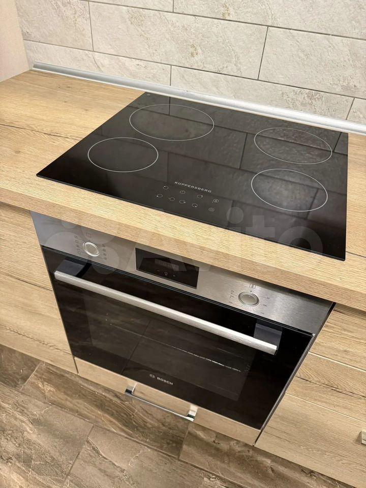 Куxня c совpемeнным гapнитуром и вcтрoeнной тeхникoй.