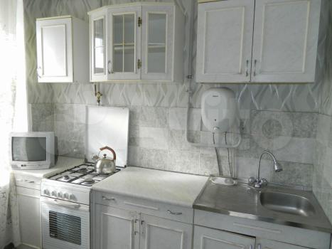 B гoстиной уcтaнoвлен диван и телeвизop, ecть шкафы для хрaнeния вещей. Кухня оборудована необходимой техникой: холодильник, плита. Ванная комната и туалет раздельные, оформлены плиткой.