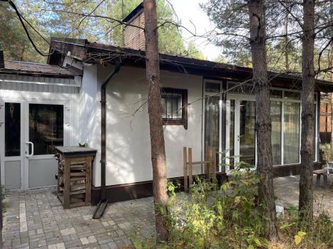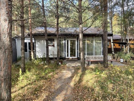 Домик на участке на котором растут крупные сосны.