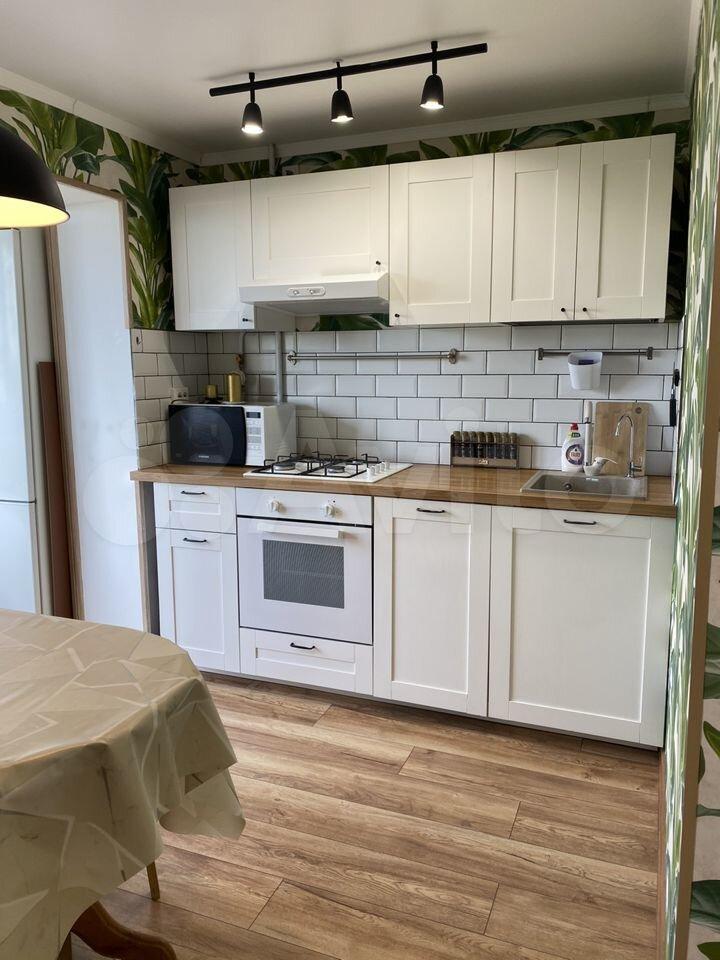 На кухне: холодильник, микроволновка, плита, стол, стулья, кухонные приборы