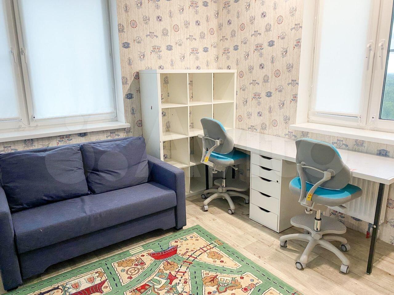 Детская комната: большой шкаф Икея. Диван, Двухъярусная кровать, стол на 2 рабочих места, стеллажи для хранения канцелярии и учебников, два детских кресла, окна оснащены безопасными замками от детей.