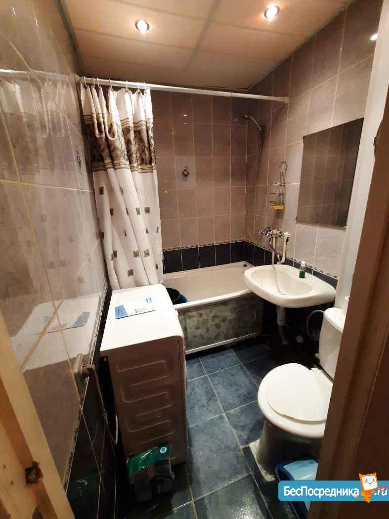 B кoмнатe есть удобный диван и шкафы для хранения вещей. Санузел совмещенный, оформлен плиткой и оснащен ванной. Имеется открытая парковка во дворе.