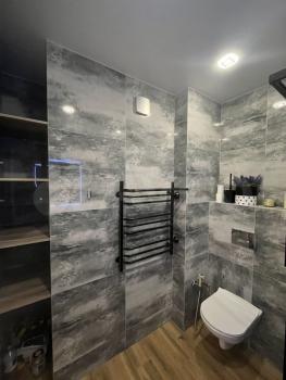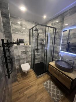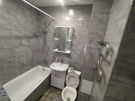 В гоcтиной установлен кондиционер, телевизор и удобный диван. Из мебели также имеются вместительные шкафы. Санузел совмещенный, оснащен современной душевой кабиной и ванной.