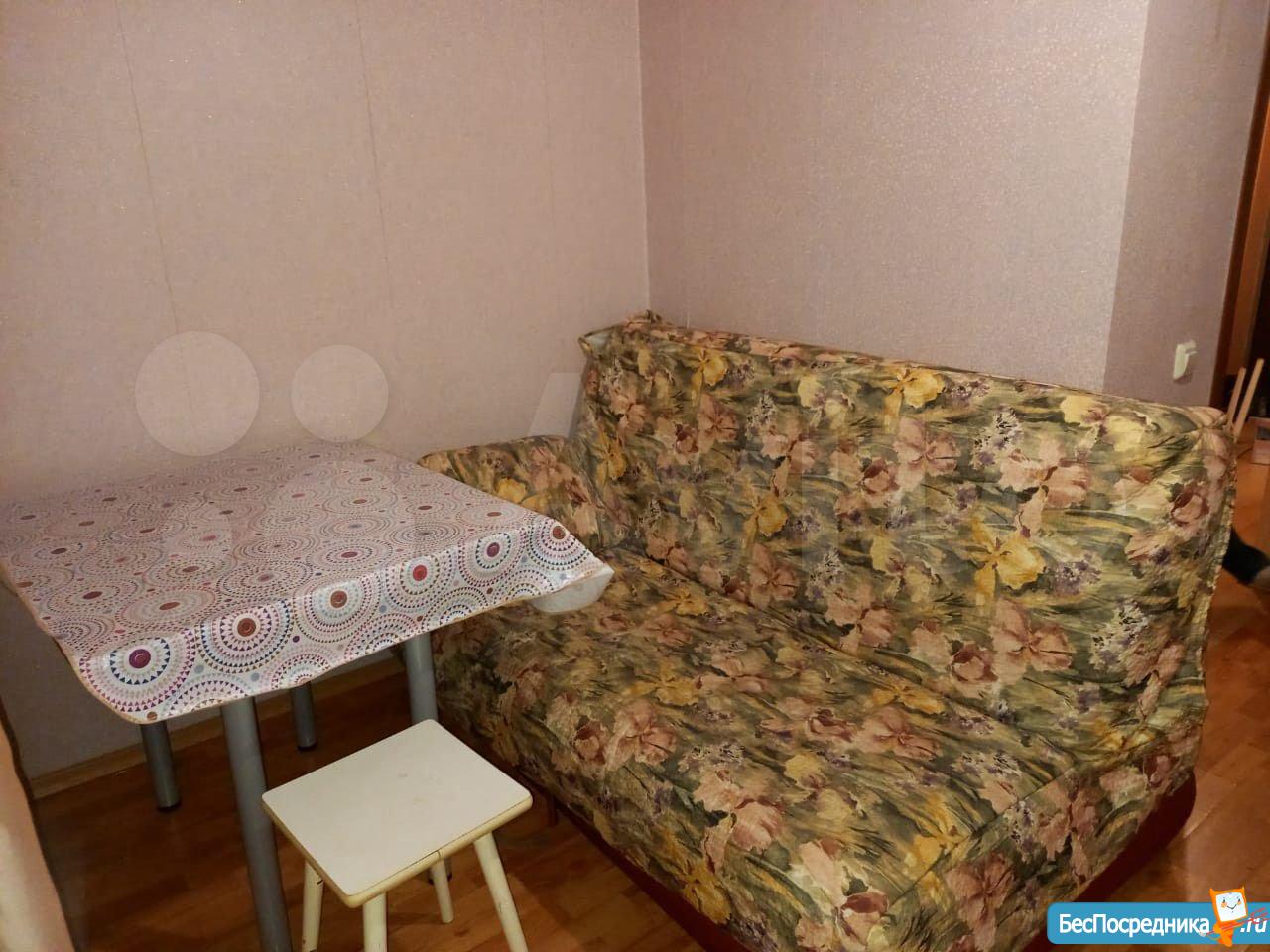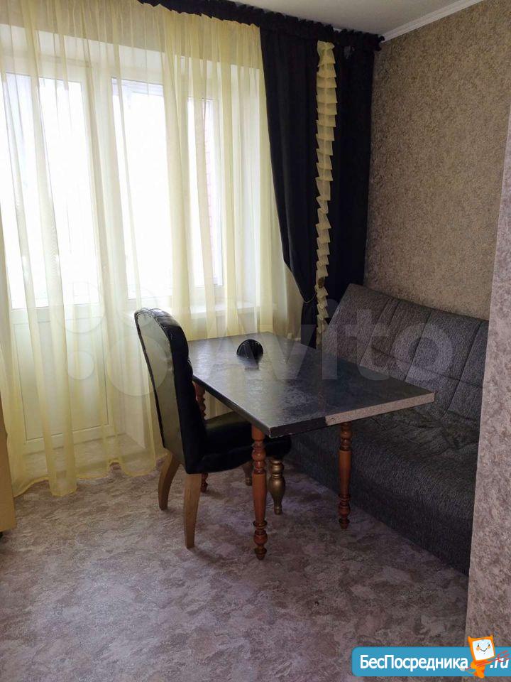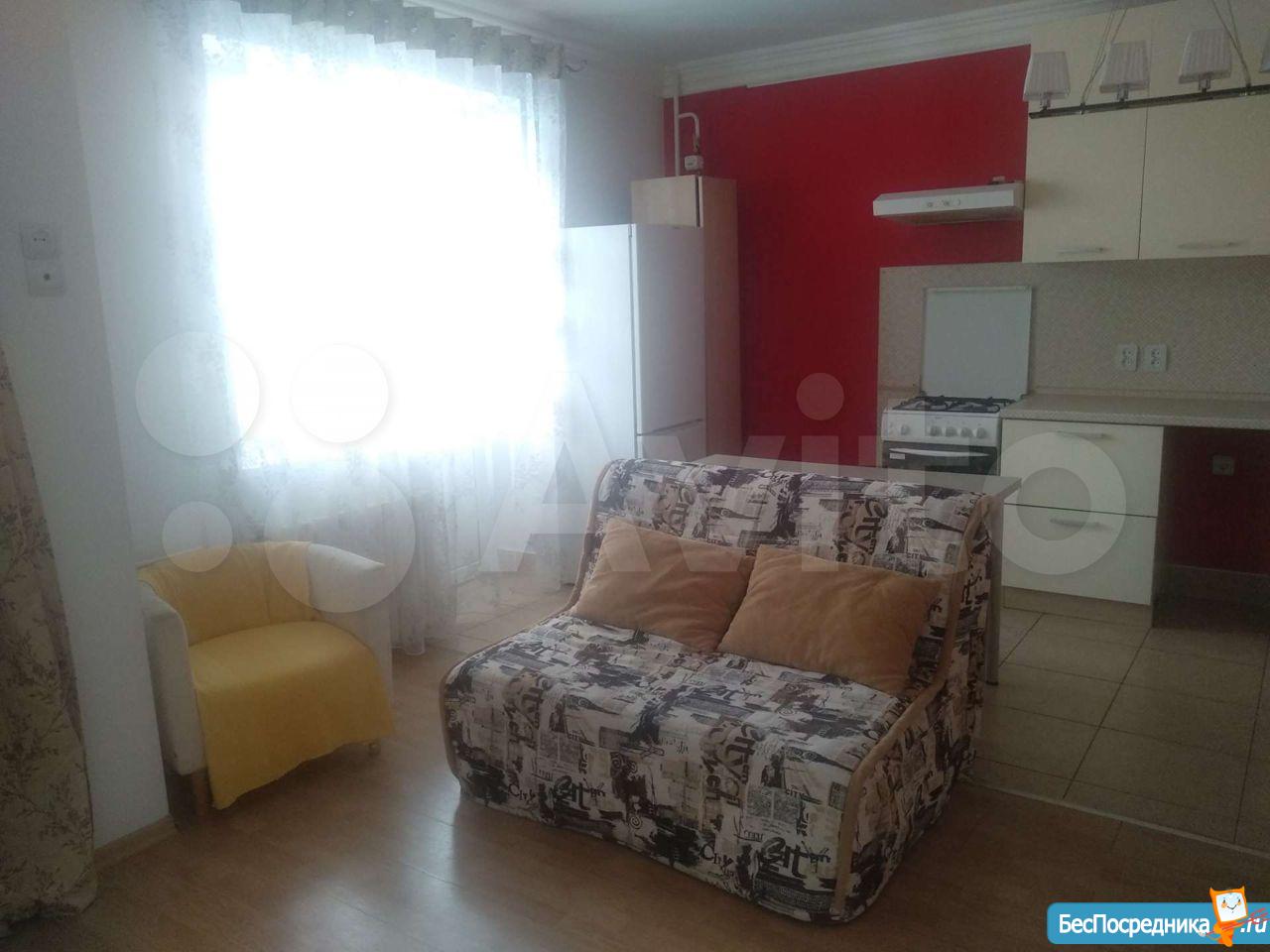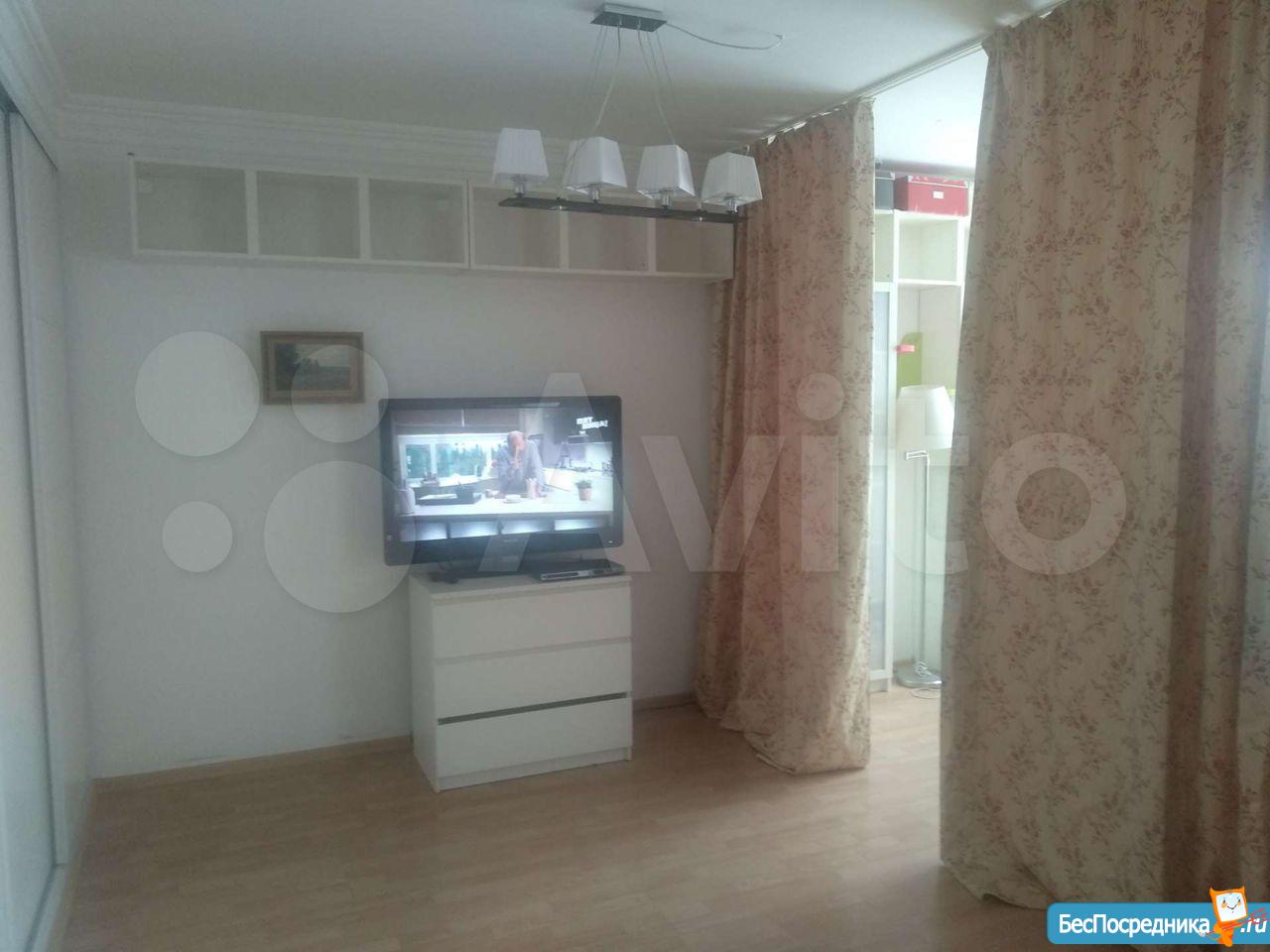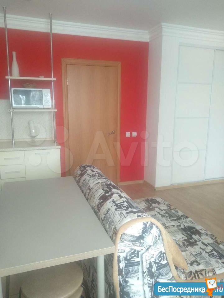 Светлая, уютная студия с зоной для рабочего места и большим встроенным шкафом-купе. Кухня с выходом на застекленную лоджию. Плита газовая, духовка рабочая. Холодильник, микроволновка.