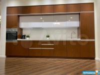 - кухонный гарнитур в современном дизайне с интегрированными ручками и доводчиками. электрическая плита, встроенный холодильник, духовой шкаф и посудомойка.