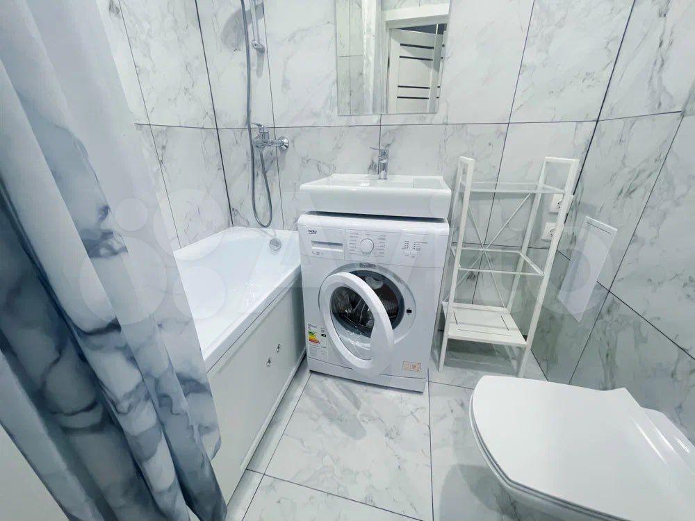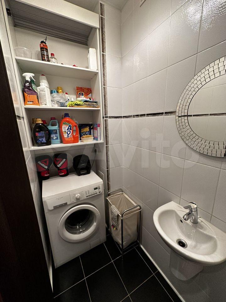 В ванной комнате:ванная,унитаз с инсталляцией,стиральная машина,зеркало,полочки для хранения.