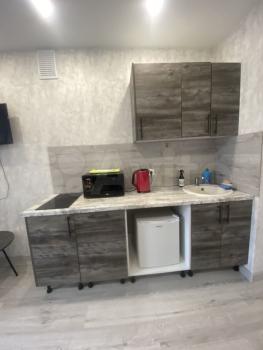 Полностью оборудованная кухня: холодильник, плита с 4 конфорками, духовка, электрический чайник, небольшой набор посуды, диван на 1 спальное место.