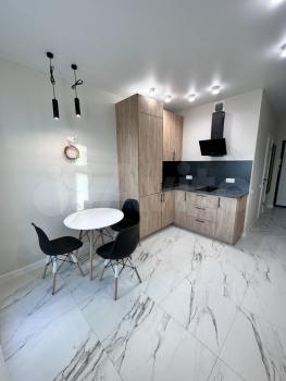 Сдается однокомнатная квартира в ЖК Евразия . Кухня - гостиная оборудована мебельным гарнитуром со встроенной бытовой техникой: варочная панель, вытяжка, встроенный холодильник, микроволновка .
