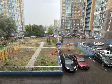 Во дворе дома детская площадка и парковка.