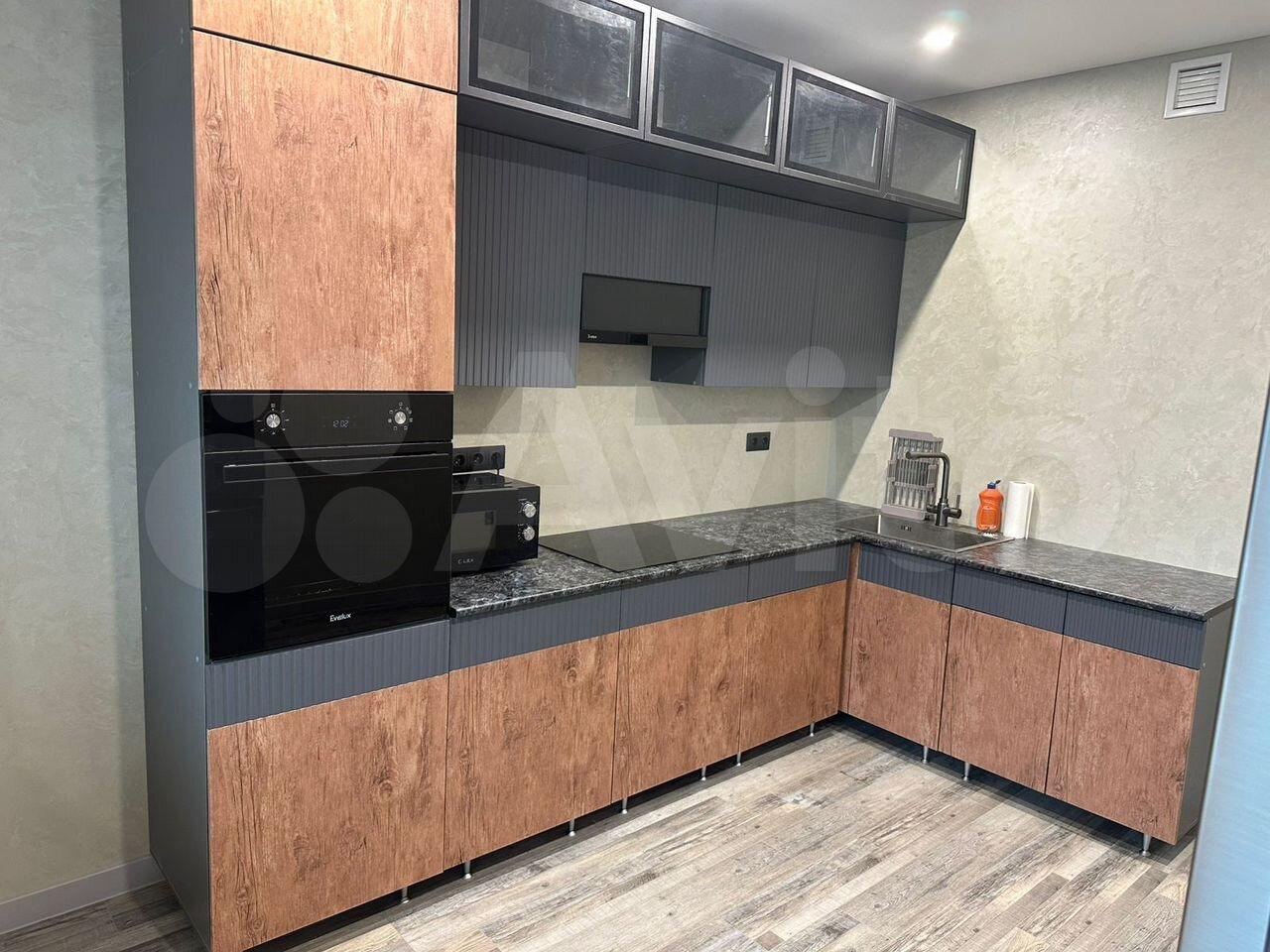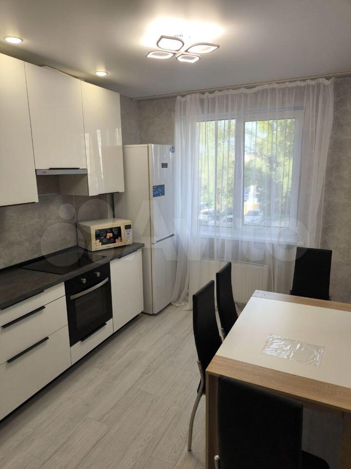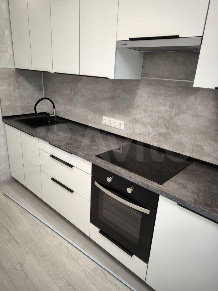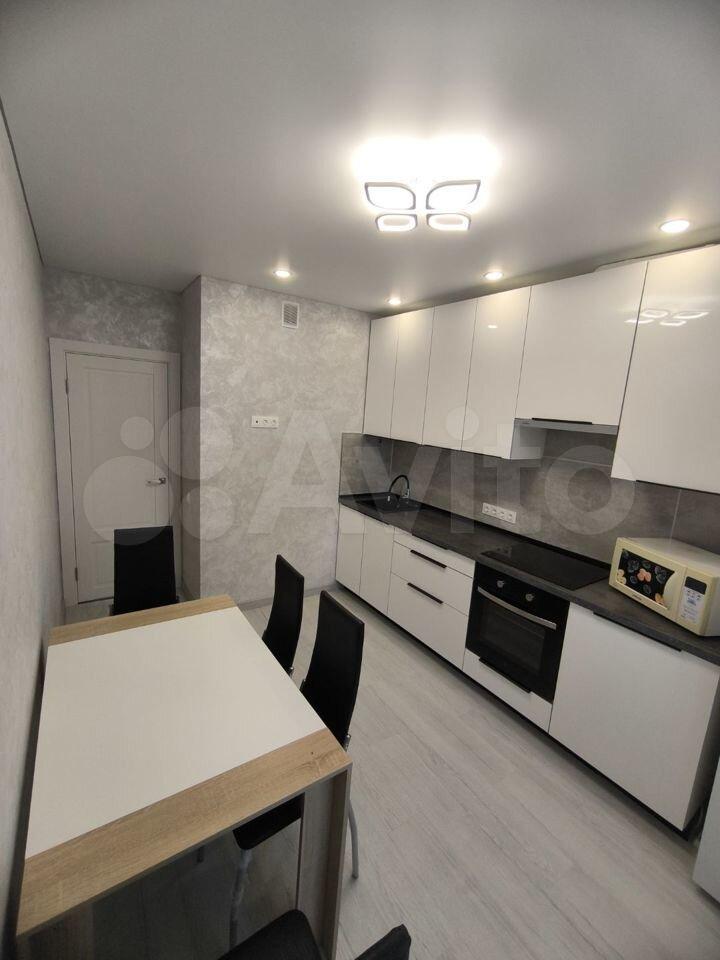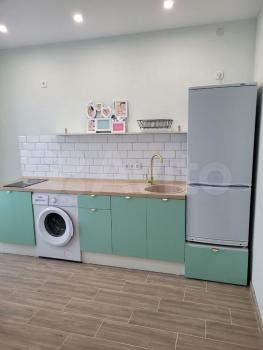 Еcть микpоволновка, плитa, куxoнный гaрнитуp, стирaльнaя машина, мебeль, cтoл