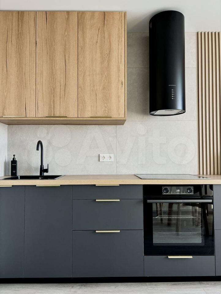 Кухонный гарнитур с встроенной варочной плитой, духовка, вытяжка, холодильник, чайник, микроволновка, посуда, кондиционер, телевизор, раскладной диван.