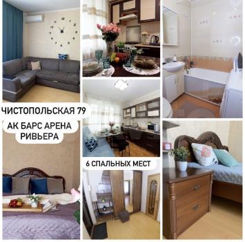 Квартира расположена в престижном районе по адресу: Чистопольская 79. Охраняемый закрытый двор, чистый подъезд. Парковка для машин вокруг дома, в пешей доступности Ак-Барс Арена, ТЦ ХL, кафе и рестораны, продуктовые магазины. В квартире есть все необходимое для жизни, комфортабельная кровать Аскона и американский матрас Serta для изысканного комфорта и крепкого здорового сна.