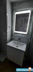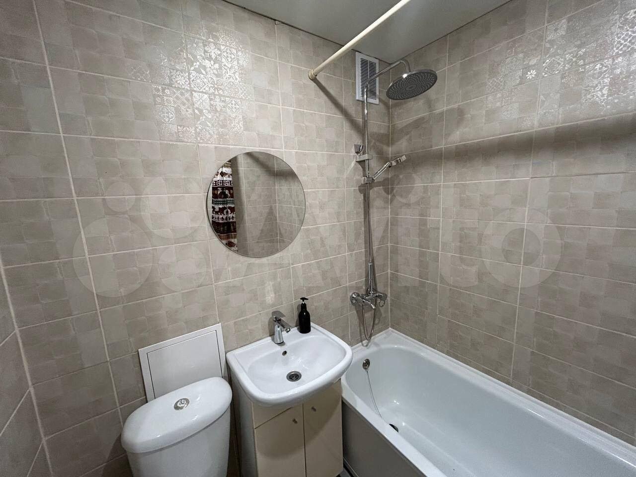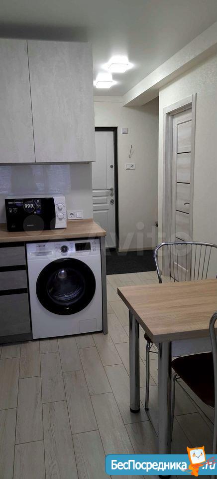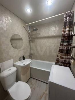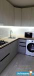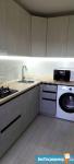 Кухня оснащена необходимой техникой, включая холодильник и микроволновую печь. Ванная комната совмещенная, с современной сантехникой и стиральной машиной.