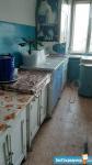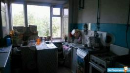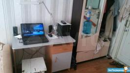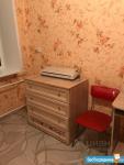 Комната в комуналке 5/5 эт. 12.3 м2- жилая,с застекленным балконом, два прихожих шкафчика для одежды и мелочей, телевизор, холодильник, два столика, 2 табуретки, 3-х местная кровать-диван. Пол линолиум, стены обои, потолок клеенные плиты, навесной шкафчик.