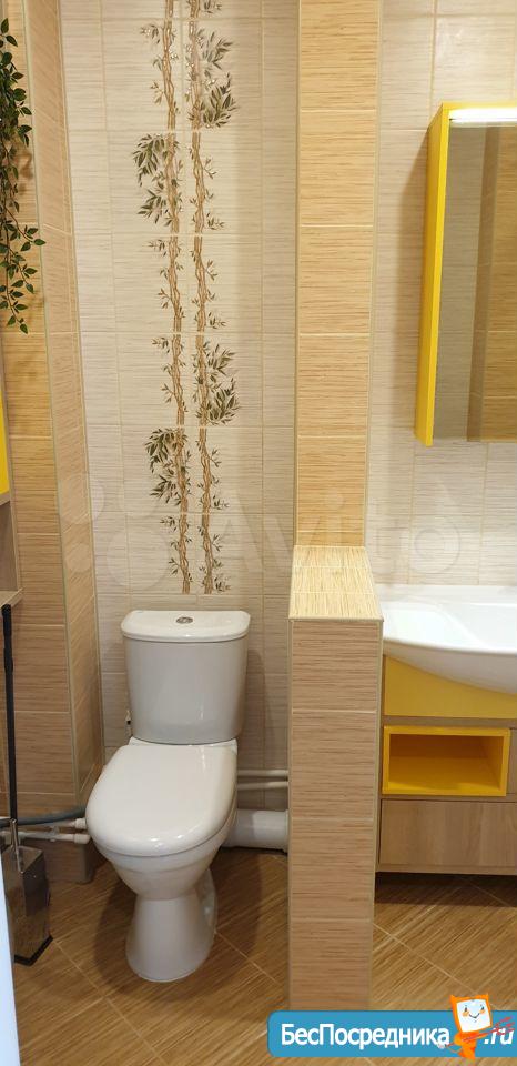 Санузел- в новой кафельной коллекционной плитке, полностью оборудованная (ванна длиной 1,8м, унитаз, раковина, тумба, навесной шкаф с зеркалом).