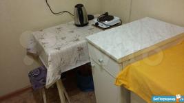 В комнате есть вся необходимая мебель, техника: холодильник, стиральная машина, электроплита, окна пластик, на полу линолеум, проведена вода, есть душевая кабина.