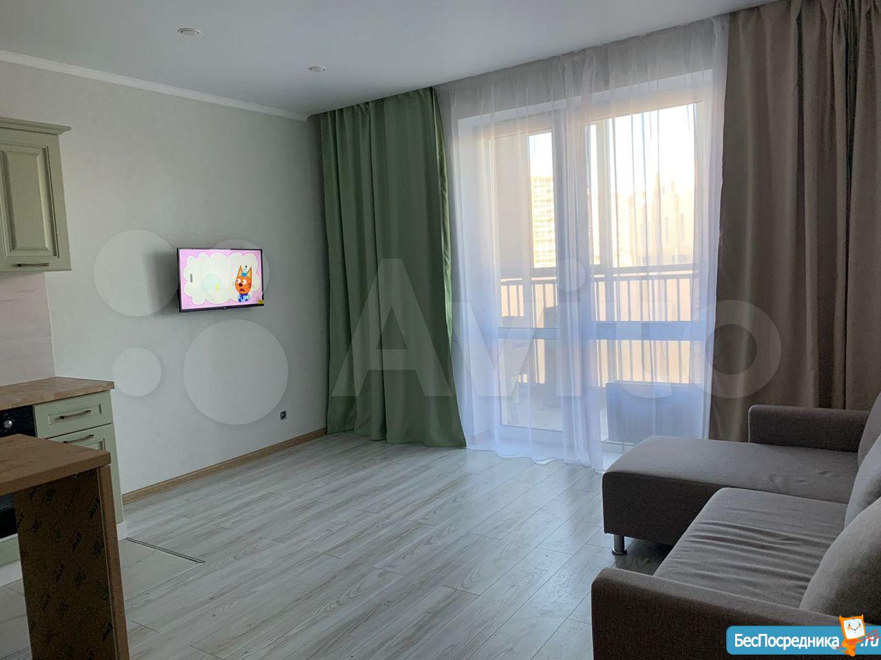 Сдаю хорошую просторную студию в ЖК Весна с ремонтом на  10 этаже, красивый вид, можно наблюдать салют.Ни кому не сдавалась.Укомплектована мебелью и техникой.Хорошее место для детей, закрытая площадка, рядом новый садик и лицей.Прогулки по ЖК доставят удовольствие, есть лес.Проводят бесплатные тренировки,кинотеатр в парке. Огромный парк.