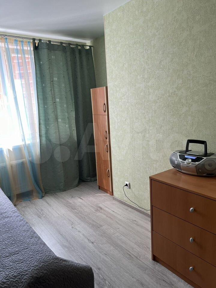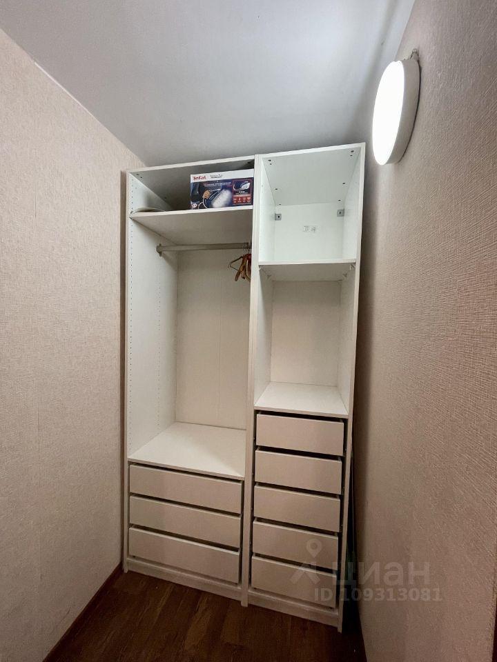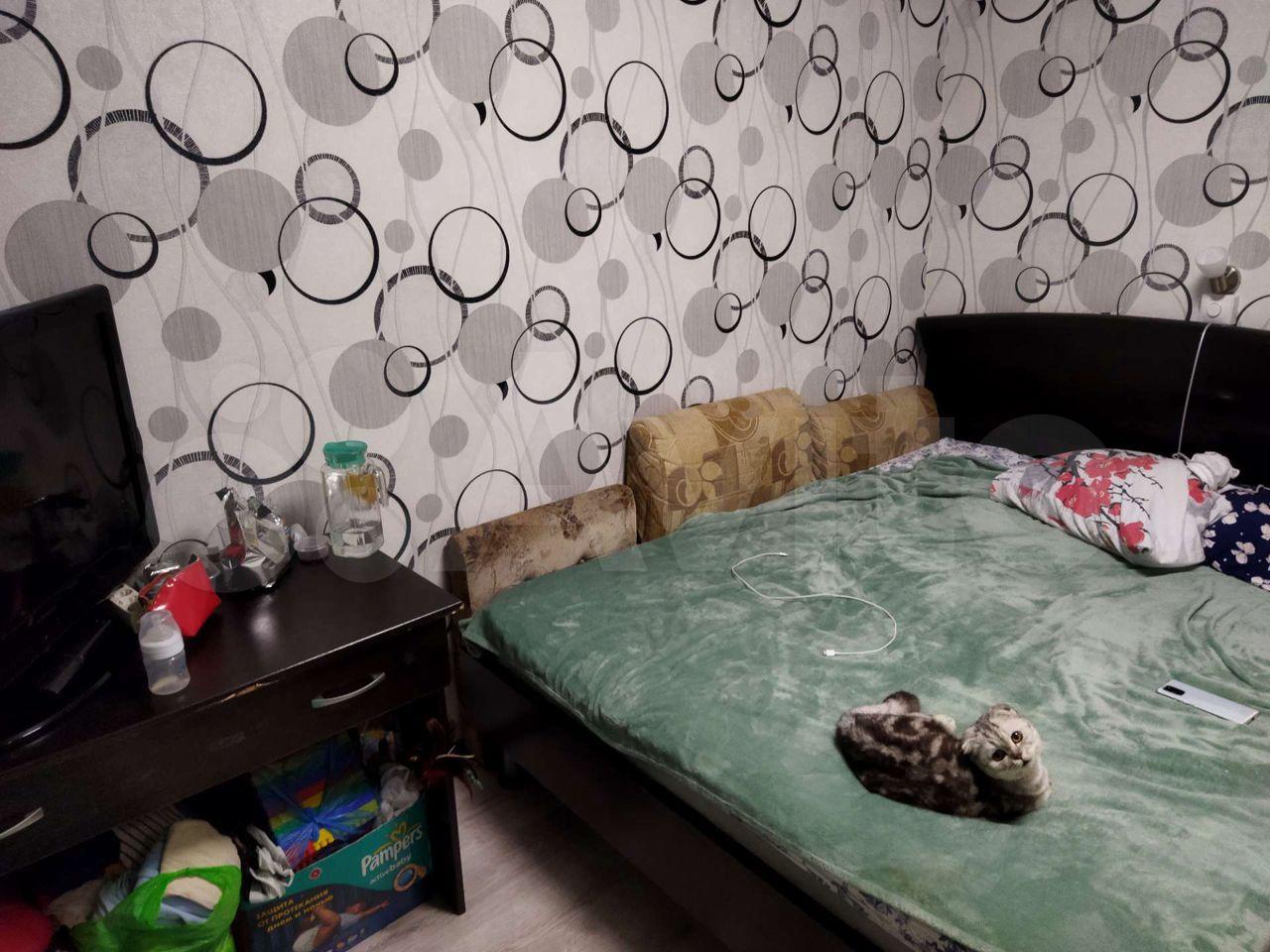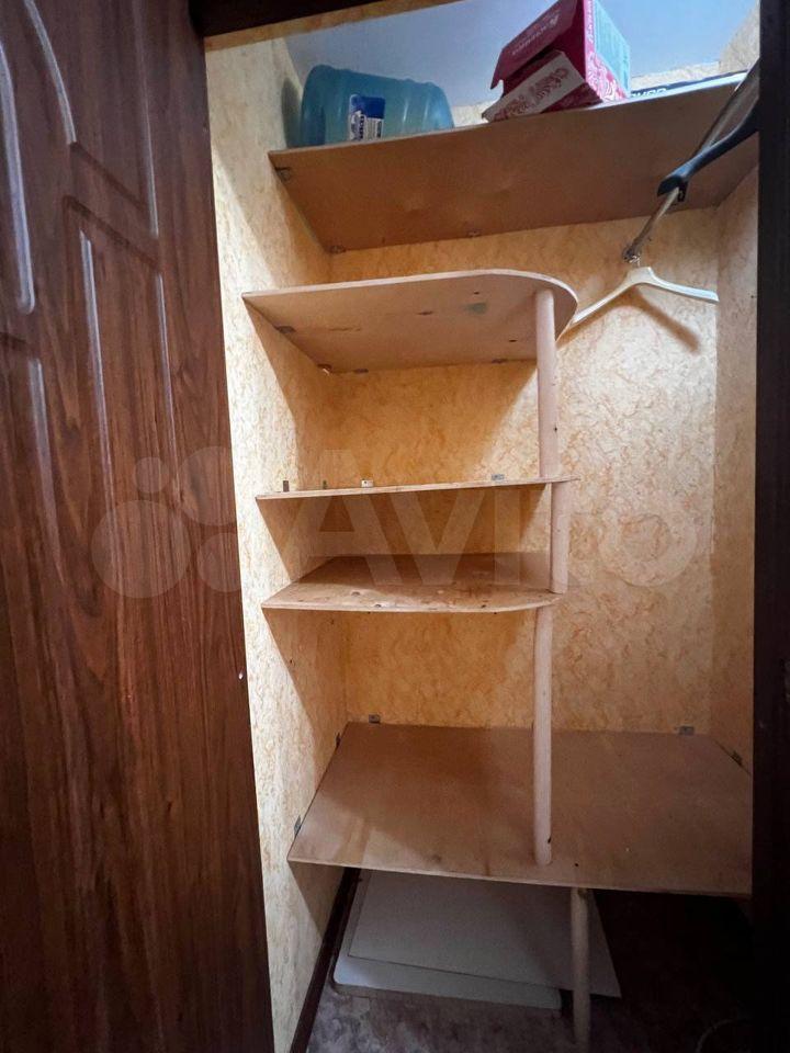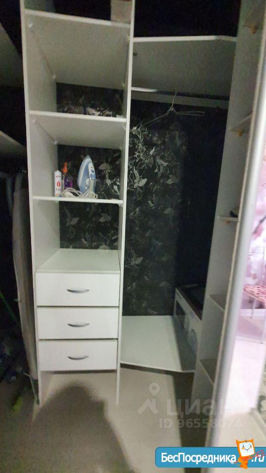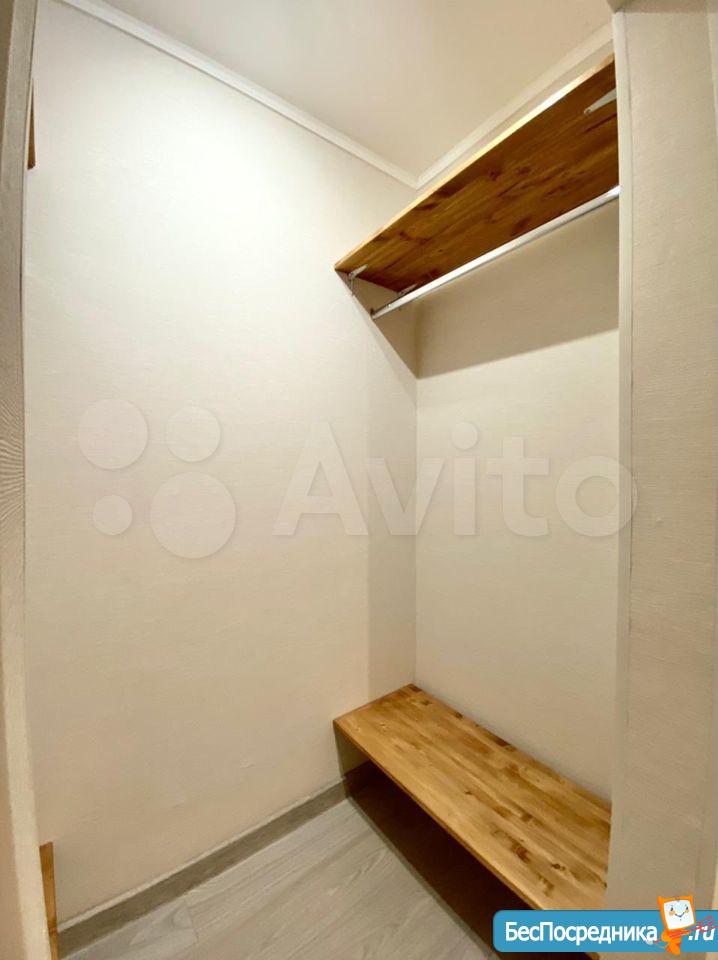 В комнате кровать, комод, кресло, в квартире есть гардероб.
