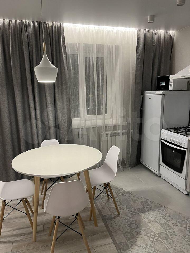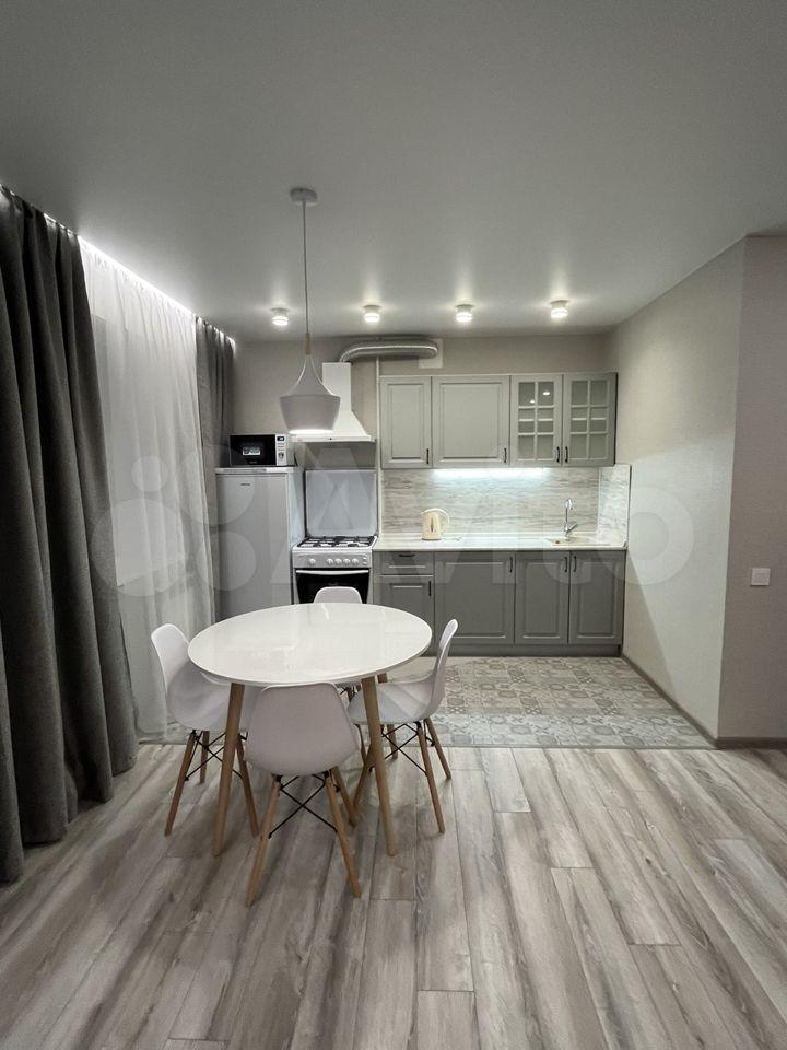 Кухня площадью 10 м² оснащена современной техникой: холодильник, плита, микроволновая печь. Из мебели — обеденный стол и стулья, шкафы.