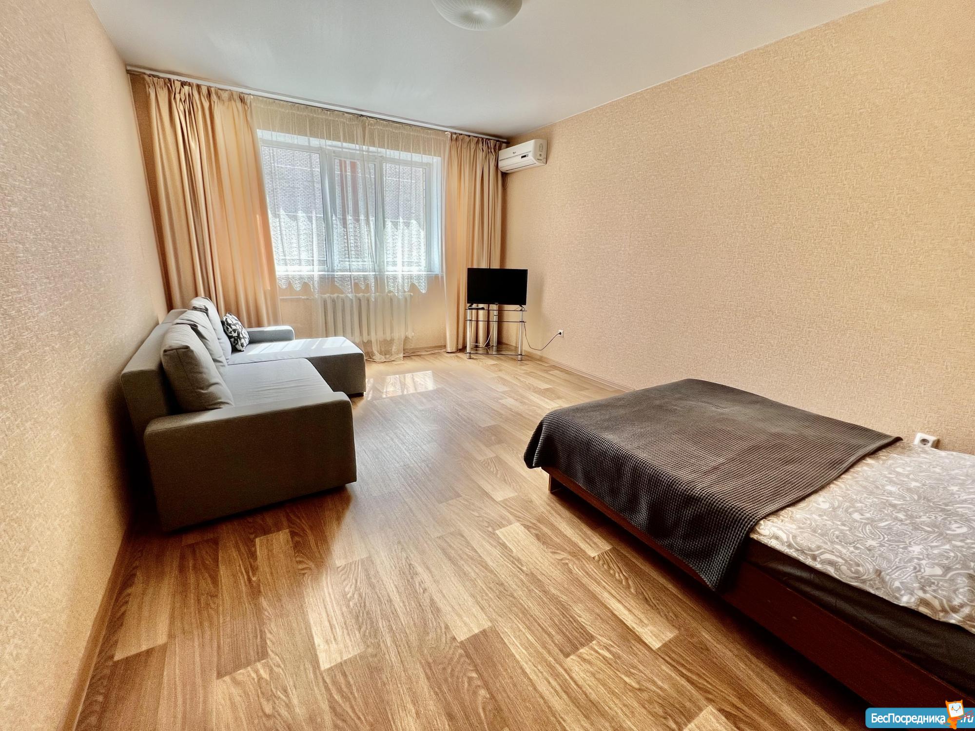 В квартире сделан качественный ремонт. Полы: ламинат. Окна: пластиковые. Сан. узел в кафеле. Есть балкон. В квартире имеется все необходимое: кухонный гарнитур, 2 дивана раскладной, cтол, стулья, огромный шкаф купе, гладильная доска, сушилка. Из техники: холодильник, плита, микроволновая печь, электрический духовой шкаф, стиральная машина, ЖК телевизор.