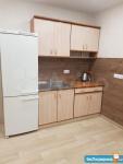 -На кухне кухонный гарнитур, электрическая плита с вытяжкой, холодильник, обеденный стол, стулья.