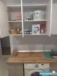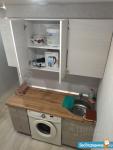 Стиральная машина, душевая, холодильник, свч печь, диван раскладной, место для приготовления пищи.