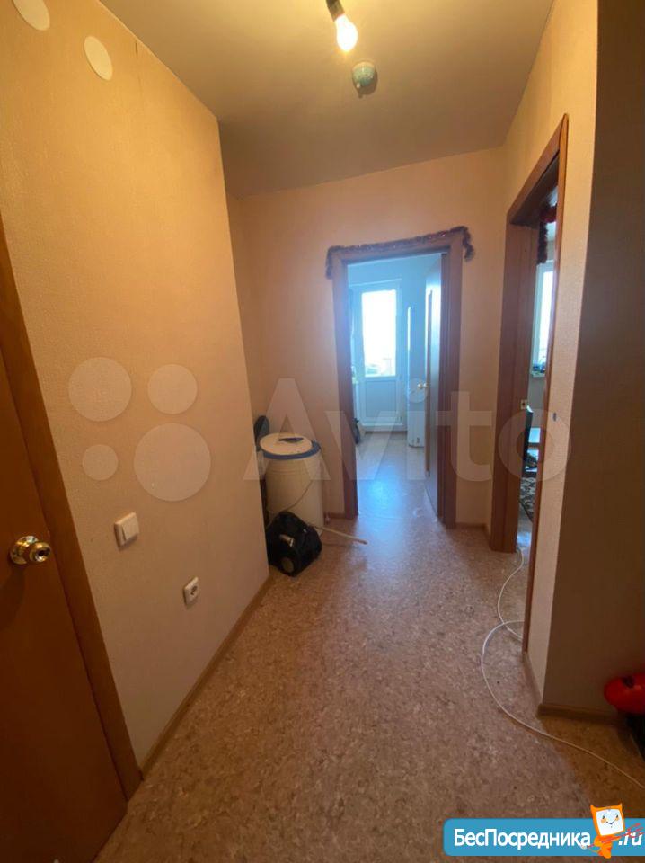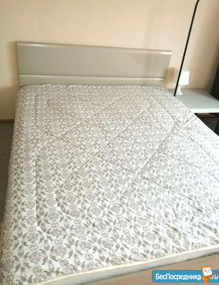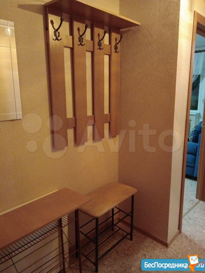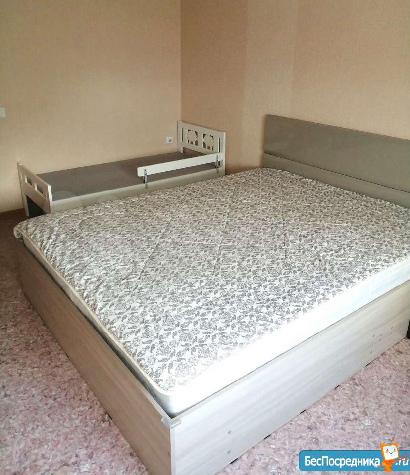 В квартире есть большая двухспалтная кровать, тумба, кухонный гарнитур, стол обеденный стулья,холодильник, вешалка в прихожей